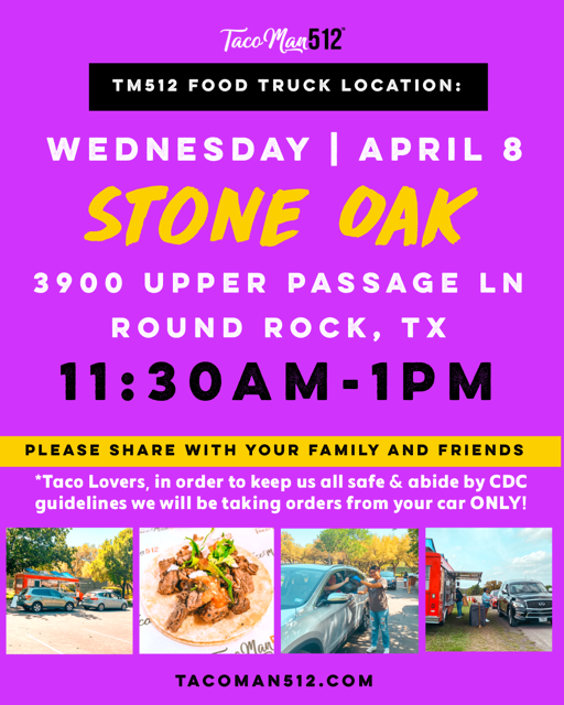 TacoMan512 will be at Upper Passage pool, Weds April 8 11:30-1:00